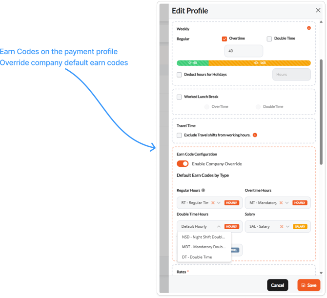 Payment profile overrides apply to all workers on that profile, superseding company defaults.