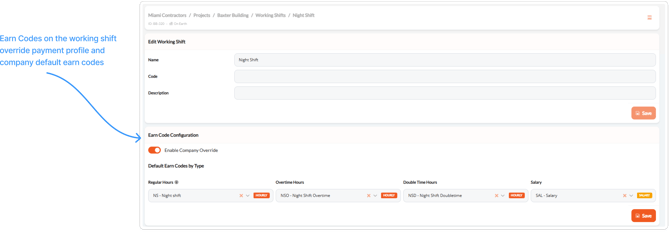 Earn codes follow a hierarchy: Company Defaults apply everywhere unless overridden at the Payment Profile level, which in turn can be overridden at the Working Shift level.
