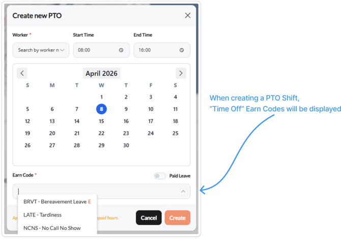 When creating a PTO shift, select a Time Off earn code at the point of shift creation. Available codes are pulled from earn codes configured under the Time Off earn type.