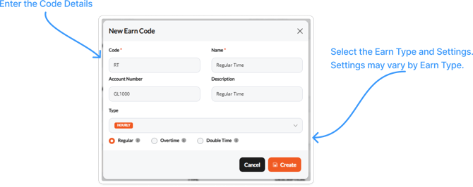 Every payroll transaction in SmartBarrel will be tied to an Earn Code — a short label (e.g., REG, OT, HOL) that maps to your payroll or ERP system. Each earn code belongs to an Earn Type, which controls how that pay is calculated and what configuration options are available.