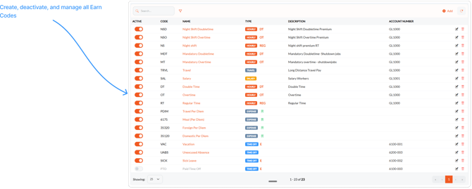 Code Management is a centralized earn code module that lets you define how hours, time off, travel, piecework, and expenses map to your payroll and accounting systems.