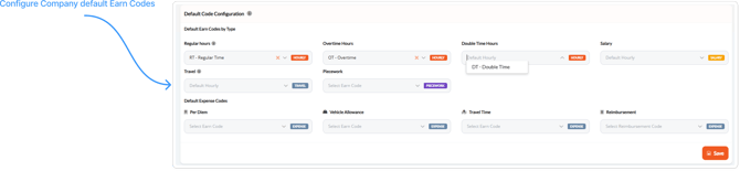 - Under Default Earn Codes by Shift Type, assign codes for: Regular, Overtime Hours, Double Time Hours, Salary, Travel, and Piecework