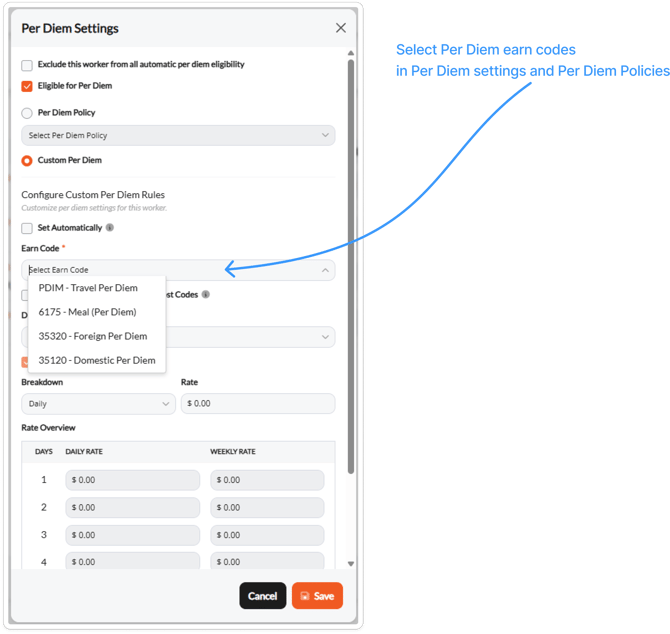 Per diem policies and payment profiles reference earn codes with the Expense earn type. Ensure the appropriate expense codes are created and assigned at the company or payment profile level before configuring per diem policies.