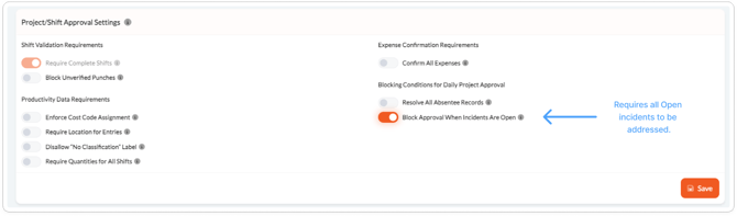 💡 Incidents must be resolved before the day can be fully approved if your project has the Resolve All Incident Reports blocking condition enabled under Project Settings → Punch Settings.