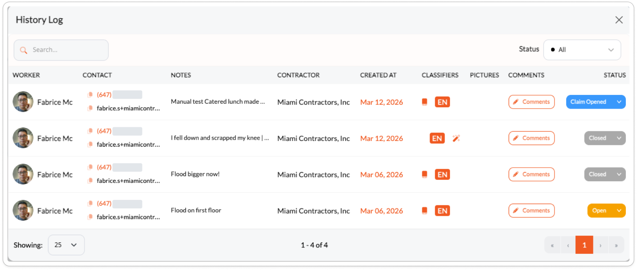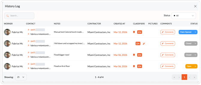 Each incident record displays the worker's name, contact information, notes describing the incident, contractor, time created, any photos submitted, and the current status.