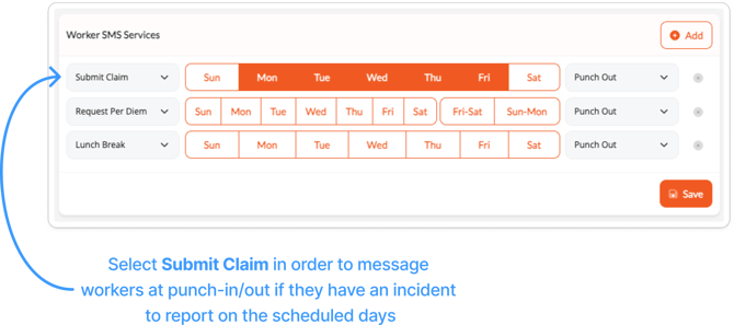 - SMS (Submit Claim) — Workers receive an automated text after punching out asking if they have an incident to report. This is configured per project under Project Settings → Worker SMS Services.