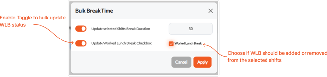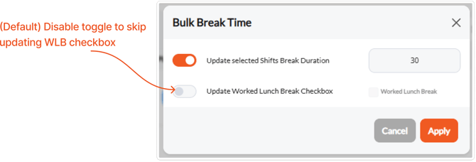 When bulk-editing break time, each field (break duration, worked lunch break) has its own toggle. Only fields with the toggle on get applied to the selected shifts.