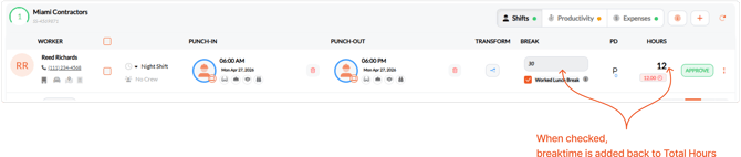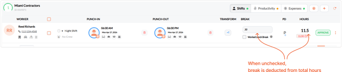 Checked: Break minutes are added back into total shift hours and distributed evenly across productivity rows on the shift. The break input locks at the value entered.