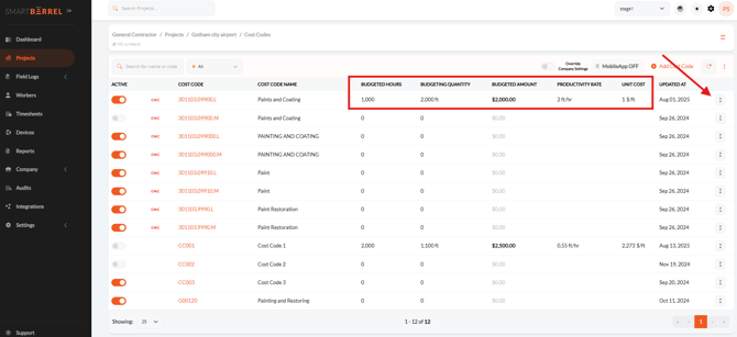 - Ensure each cost code includes budgeted hours, quantities, amounts, and units of measure. If any of these are missing, click the three-dot icon and select Edit to add/edit the necessary details.