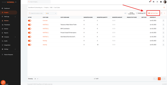 - From the project settings, select Cost Codes option to assign budgeted hours, amount, quantity and unit of measure.
