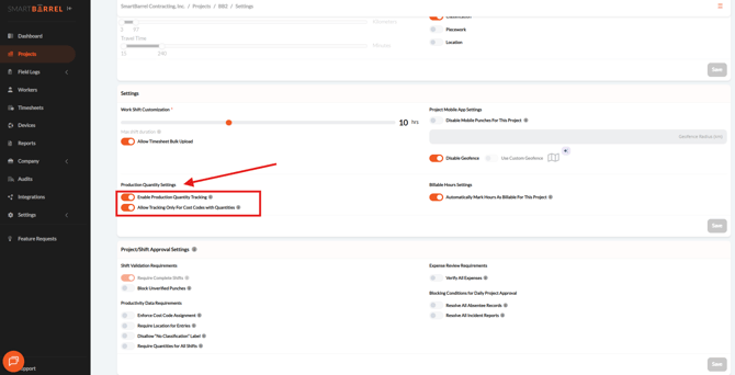 - Enable Production Quantity Tracking: Allows entering quantities for any cost code on the timesheet, even if it is not budgeted.