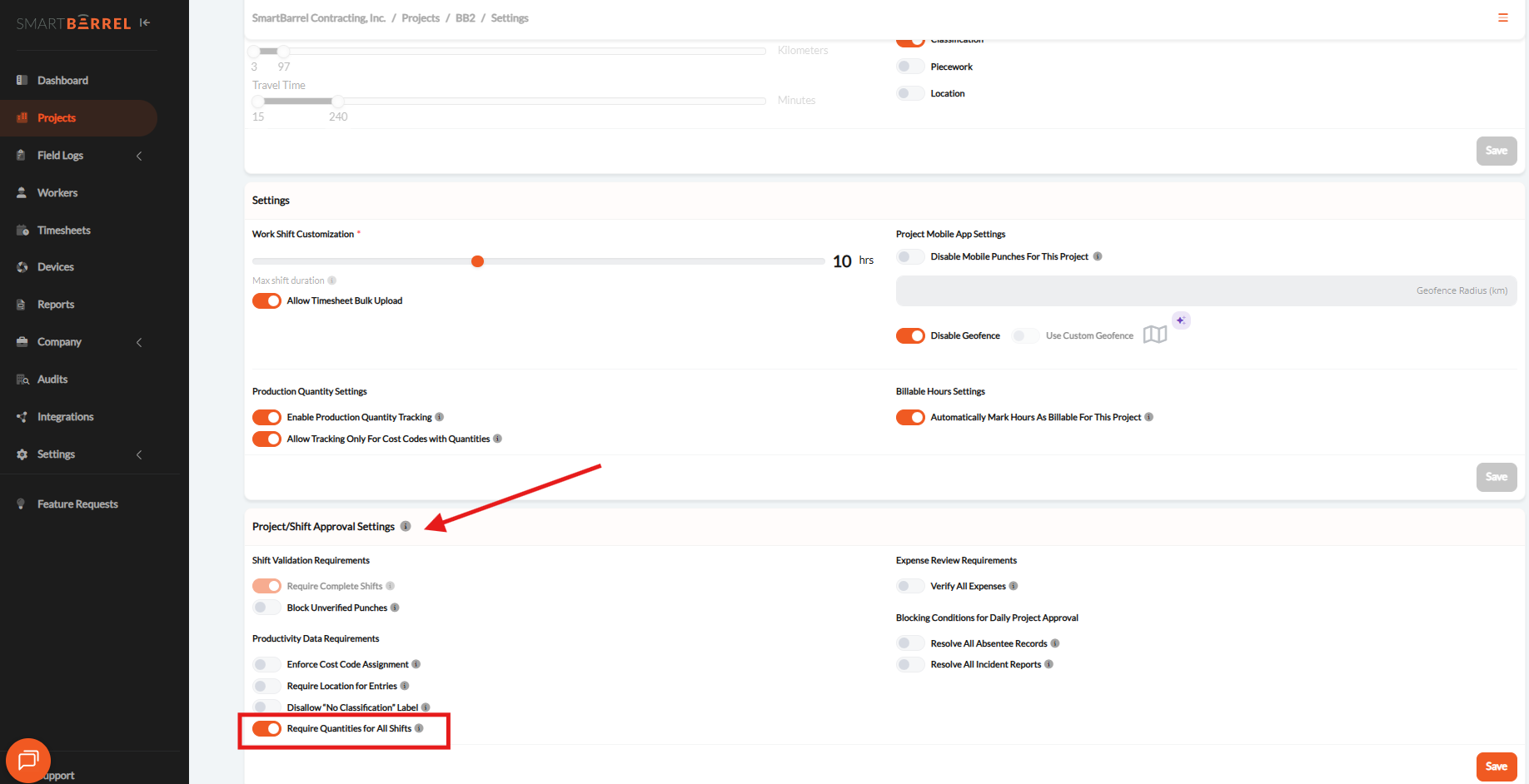Tip: Turn this on when you budget quantities daily. It prevents timesheet approval until each cost code has a quantity recorded.