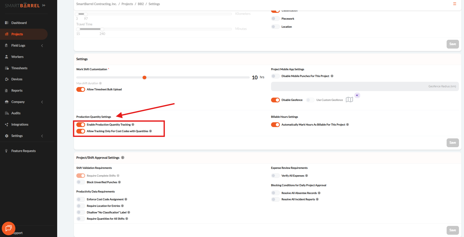 - Navigate to project > Go to project settings > Scroll down to Production Quantity Settings.