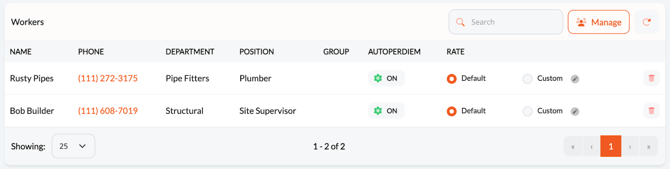 This page is where you create and manage all Per Diem Policies for that project and assign workers to those policies.