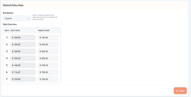 - The Rate column indicates if the worker is getting the policy’s Default Policy Rate or a Custom rate that overrides the policy’s.
