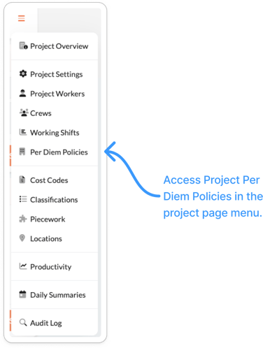 - Navigate to Per Diem Policies in the project settings menu.