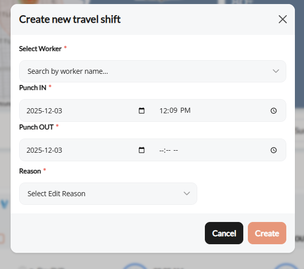 💡Tip: The Reason field is mandatory and needs to be added before creating a travel shift