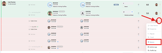 Click the 3-dots menu at the end of the shift to delete or restore a travel shift. Once deleted, the shift will change to red.