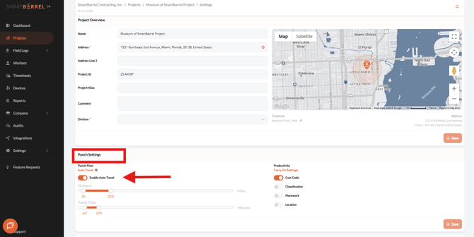 Settings are enabled per project: Travel settings are configured per project based on allowed distance and time. (Project Settings → Punch Flow)